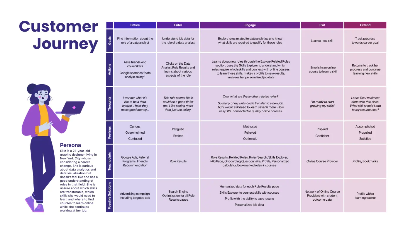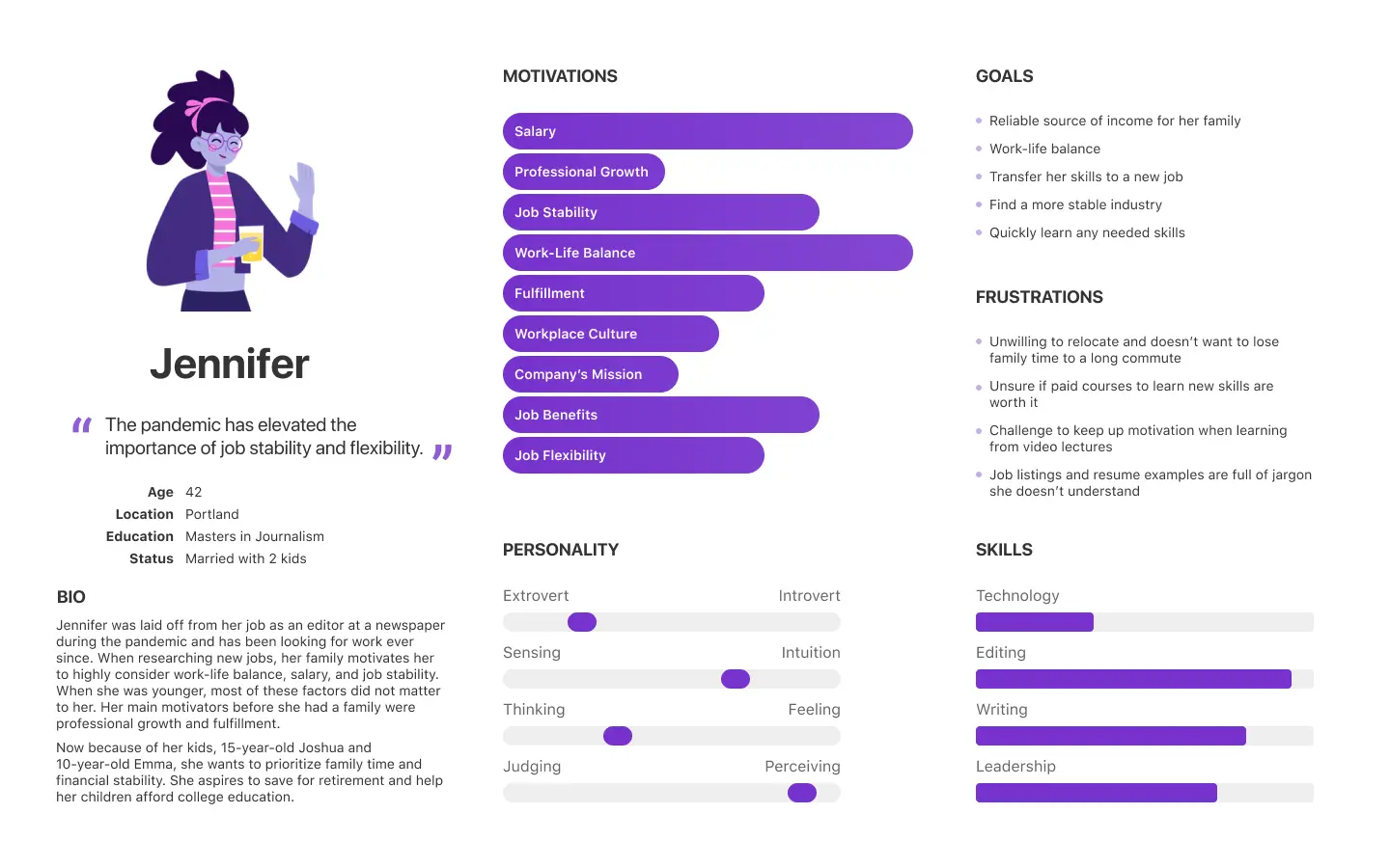 By summarizing the types of users we face, we made three Persona models: Ethan, Jenn, and Ellie. These roles that understand the research situation help us to consider different user groups when designing while keeping in line with the needs of potential users.